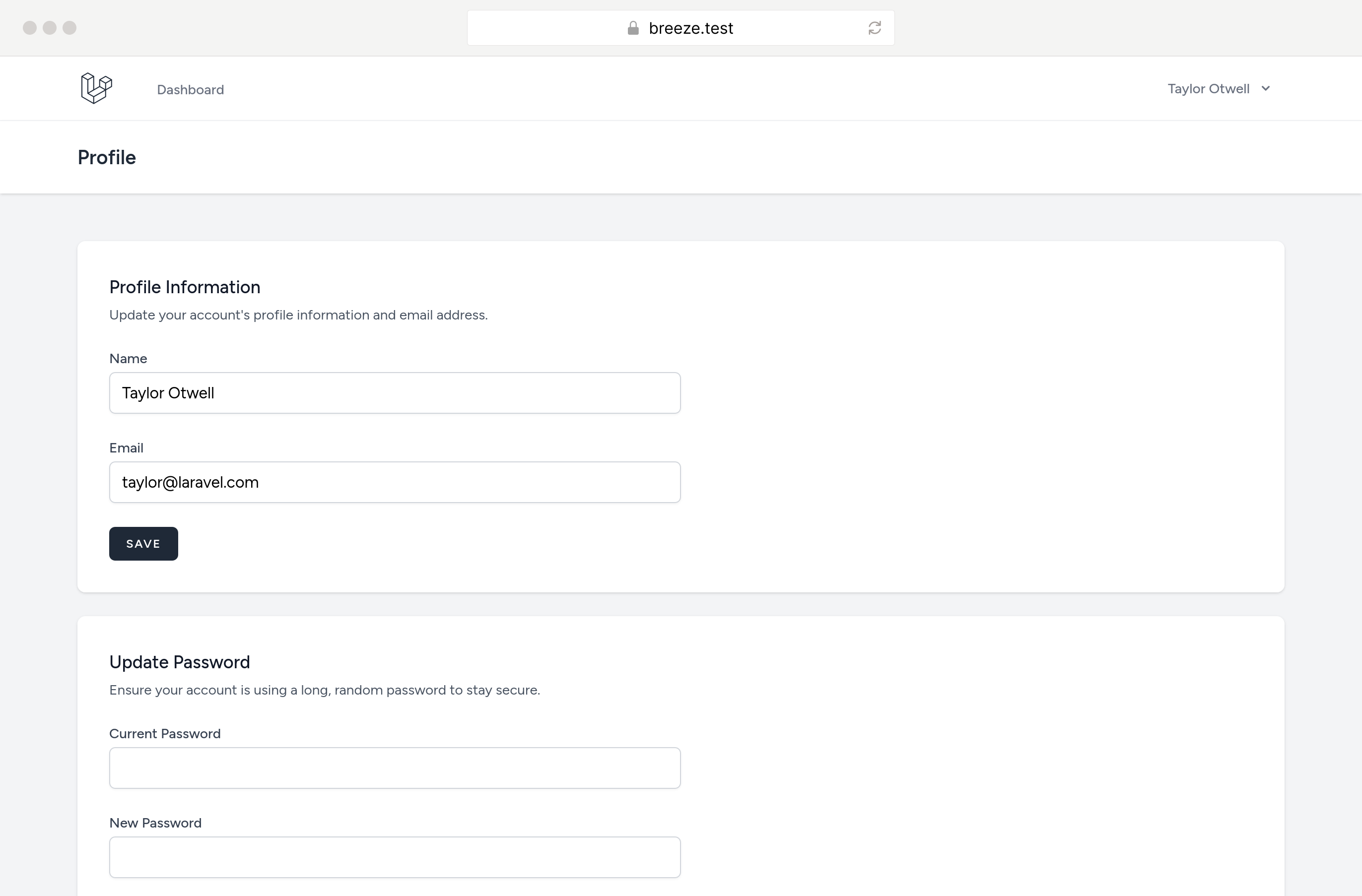 Laravel Breeze is a light-weight starter kit that includes Tailwind styled authentication user profile management templates.